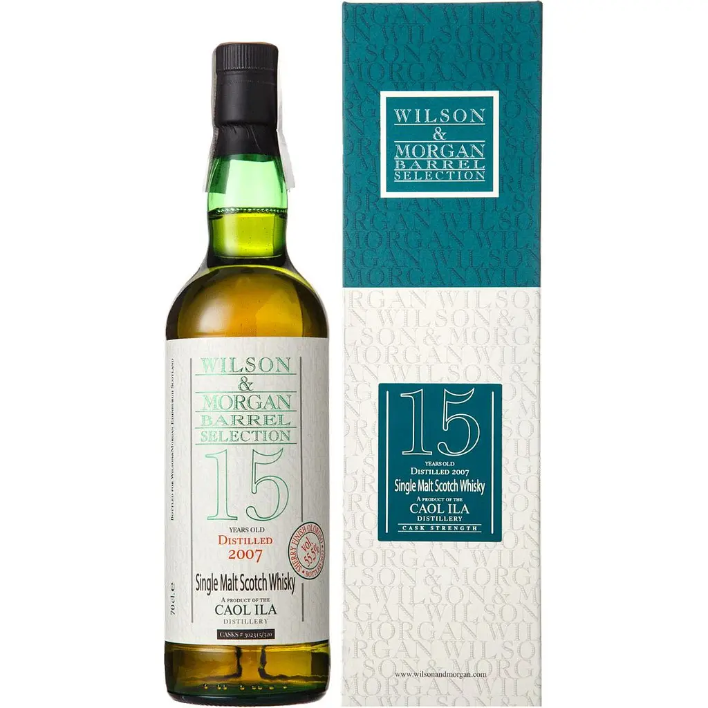 Віскі Wilson & Morgan Caol Ila 15 yo Oloroso Finish Cask #302315-320 Single Malt Scotch Whisky - ще один експеримент компанії щодо поєднання контрастних ароматів сухих та винних бочок Oloroso з дуже димним солодом Islay. В ароматі відчуваються багатогранні ноти старого дерева у поєднанні із пряним відтінком евкаліпта та свіжого апельсина. Вплив більш дубового барила помітний у смаку: багато лакриці, але потім він переходить у тонкий баланс солодкості (червоні яблука та родзинки), земляних відтінків та шкіри. Знову пряний та бальзамічний смак із щедрим відтінком гірких апельсинових кірок.