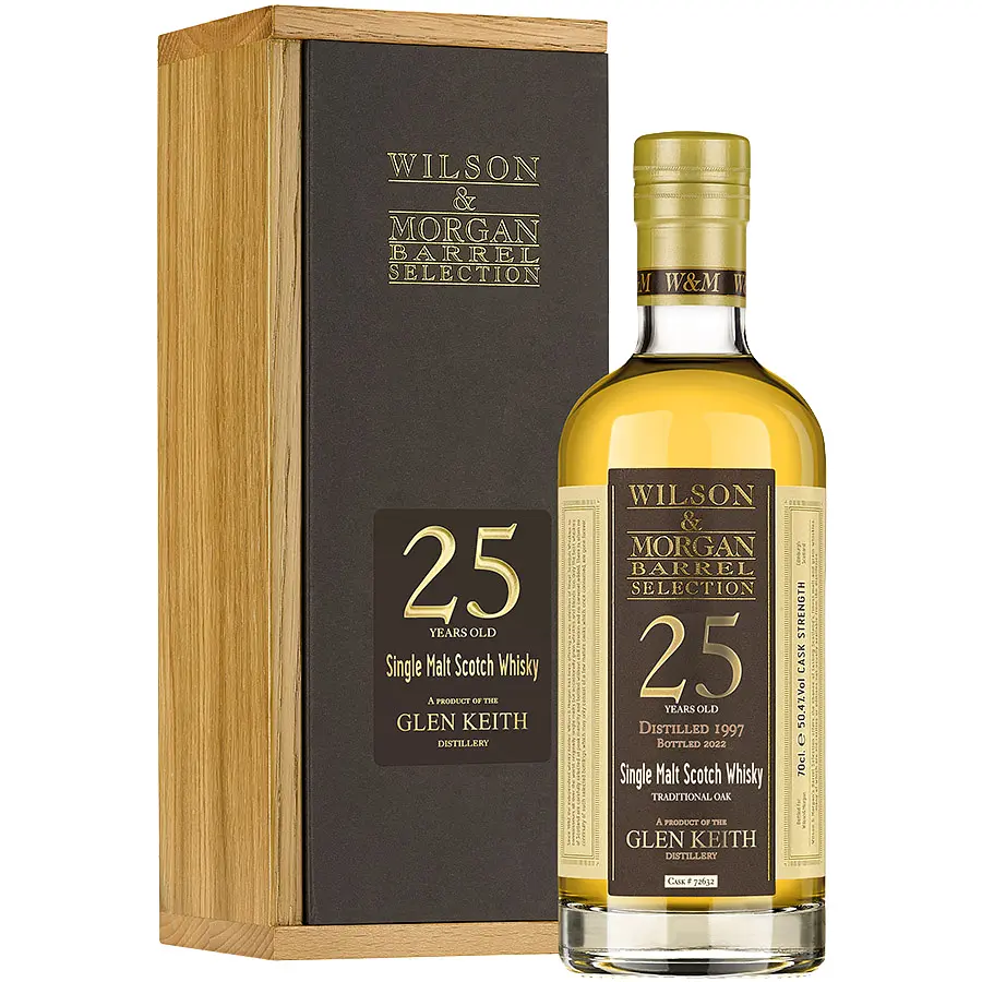 Віскі Wilson & Morgan Glen Keith 25 yo Single Malt Scotch Whisky має янтарно-золотистий колір. В ароматі легкий, свіжий, оманливо простий, з тонами меду, ромашки, бджолиного воску та прополісу. Квіткова простота солоду повністю збережена у цьому ніжному та м'якому виразі, який порадує поціновувачів вишуканих смаків. Вражає неквапливим темпом свого розкриття: дуже солодовий, дуже чистий, але водночас трохи трав'янистий, з нотками весняних та літніх квітів (наприклад, лаванди). Однак солодкість злаків і меду не приторна, а загальний характер залишається сухим і твердим: щільні таніни дуба починають рости, що призводить до чистого фіналу з відтінками білого перцю та трав.