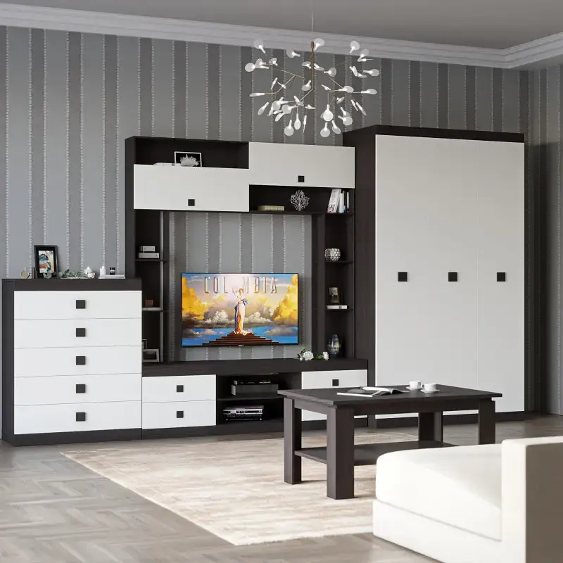 Функціональна конструкція складається з чотирьох окремих елементів, що дозволяє встановити меблі у необхідному порядку. Велика шафа для зручного зберігання одягу. Високий комод укомплектована п'ятьма висувними ящиками. Меблевий гарнітур доповнюють стінка з нішою для тв та журнальний стіл.