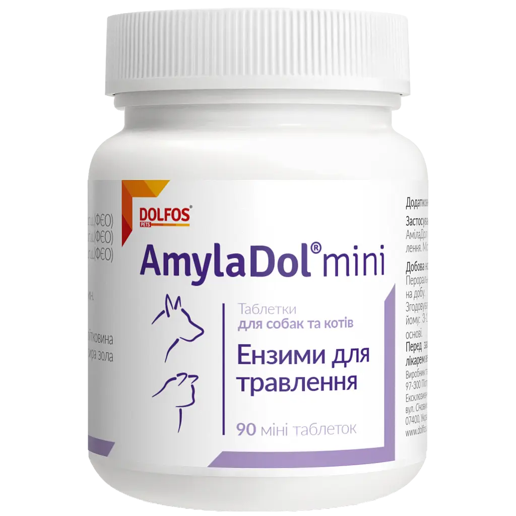 Dolfos AmylaDol mini - кормова добавка для собак та котів, що містить натуральні ферменти травлення, які забезпечують перетравлювання жирів, вуглеводів і протеїнів. Рекомендується для тварин хворих та схильних до захворювання на панкреатит. Показаний при різних типах порушень травлення, запаленні підшлункової залози та як монотерапія при синдромі мальдигестії (нудоти, відрижка, дискомфорт в абдомінальній ділянці, метеоризми, діарея).