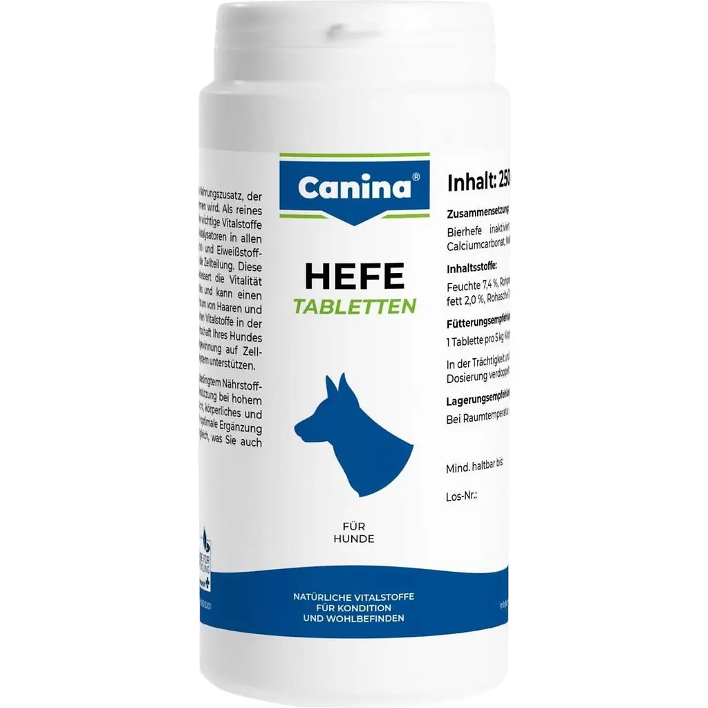 Дріжджові таблетки Canina Hefe - це апетитна та смачна добавка до корму, яка легко сприймається собакою. Завдяки особливій технології обробки пивних дріжджів вітаміни та мікроелементи знаходяться в білкових комплексах, що зберігає їх у формі найбільшої активності.