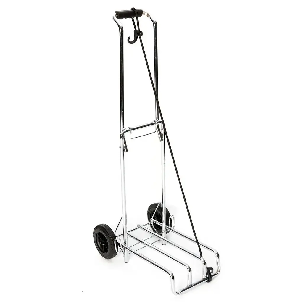 Bo-Camp Luggage Trolley Foldable виготовлений із міцної хромованої сталі, що гарантує надійність та тривалий термін есплуатації. Зручна ручка висотою 100 см забезпечить комфортне транспортування вантажу, а великі колеса діаметром 14 см дозволять легко переміщати візок навіть по нерівних поверхнях. Розмір платформи для багажу 26х40 см забезпечує достатньо місця для різноманітних предметів, а розміри у складеному стані роблять візок ідеальним для зберігання в автомобілі, гаражі чи навіть вдома. В комплекті з візком поставляється еластична стяжка для багажу довжиною 150 см, яка допоможе ще надійніше закріпити вантаж на платформі.