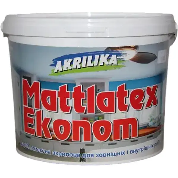 Краска акрилова інтер'єрна Akrilika Mattlatex Econom стійка до сухого та мокрого стирання. Призначено для фарбування стелі та стін всередині приміщень та зовнішніх робіт. Підходить для фарбування бетону, гіпсокартону, плит ДСП, МДФ, цементної чи синтетичної штукатурки, шпалер, цеглини, каменю, дерев'яних поверхонь, а також стельових плінтусів (багетів).