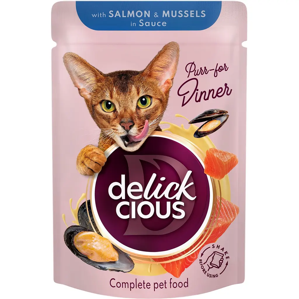 Повнораціонний консервований корм для дорослих котів. Вишуканий делікатес для справжніх поціновувачів риби - соковитий лосось у поєднанні з ароматними мідіями в кремовому соусі у консервованому кормі зручного формату, що дозволяє зберігати усі корисні властивості раціону і дарує коту чисту насолоду від їжі. А шовковистий соус, яким огорнуті рибні шматочки, підкреслює природний насичений смак. Підходить для годування на регулярній основі.