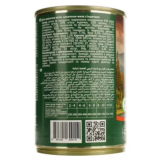 Рекомендації з харчування: Рекомендована добова кількість вказана в таблиці поживності. Завжди подавайте з мискою свіжої води і подавайте при кімнатній температурі. Після відкриття зберігати в холодильнику та спожити протягом 48 годин. Термін придатності та номер партії дивіться на упаковці.