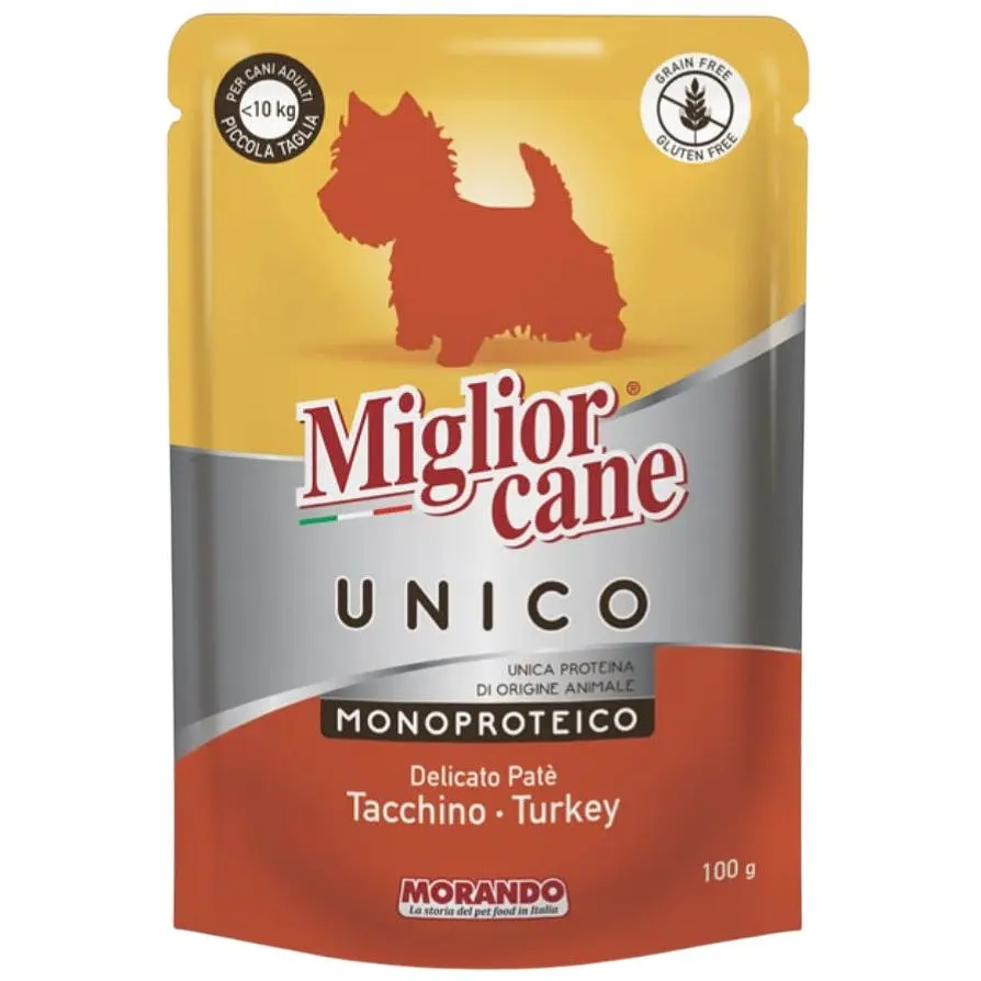 Morando Migliorcane Unico містить тільки одне джерело тваринного білка - індичку. Така монопротеїнова формула підходить собакам, схильним до харчових алергій або небажаних реакцій на окремі інгредієнти. Корм добре підходить для собак із чутливим травленням. Відсутність зернових компонентів робить харчування більш фізіологічним і знижує ризик харчової чутливості.
