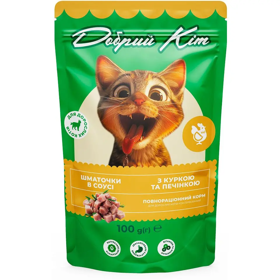 Вологий корм Добрий Кіт для дорослих котів - це збалансоване харчування українського виробництва, створене для забезпечення улюбленця всіма необхідними поживними речовинами. Рецептура розроблена з урахуванням фізіологічних потреб зрілих тварин, щоб підтримувати їхню активність та здоров’я щодня. Шматочки у соковитому соусі мають привабливий аромат та смак, який подобається домашнім хижакам. Завдяки оптимальному поєднанню білків, жирів та вітамінів, цей раціон допомагає підтримувати ідеальну форму та забезпечує легке засвоєння компонентів без зайвого навантаження на систему травлення.