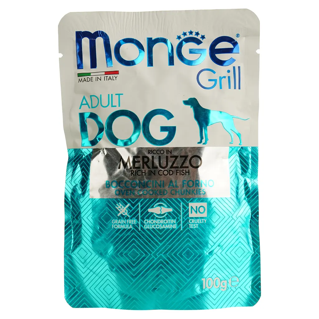 Вологий корм Monge Dog Grill з тріскою - це повноцінний збалансований раціон для собак.