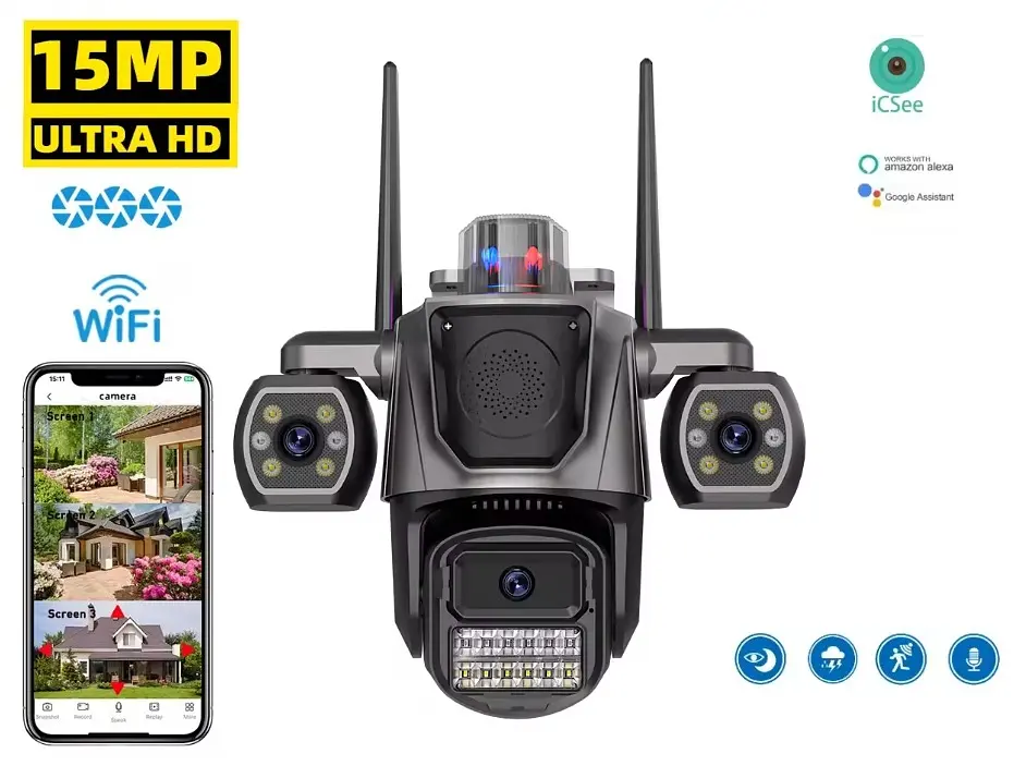 Вулична камера P17 - камера 3 в 1. Завдяки 3-м об'єктивам (3 незалежні) вона може виконувати функцію трьох камер та одночасно вести спостереження за трьома секторами, таким чином замінюючи 3 камери.