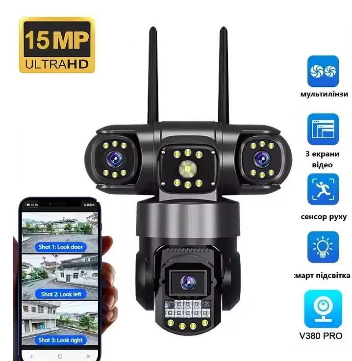Вулична камера SC28 - камера 3 в 1. Завдяки 3-м об'єктивам (3 незалежні) вона може виконувати функцію трьох камер та одночасно вести спостереження за трьома секторами, таким чином замінюючи 3 камери.