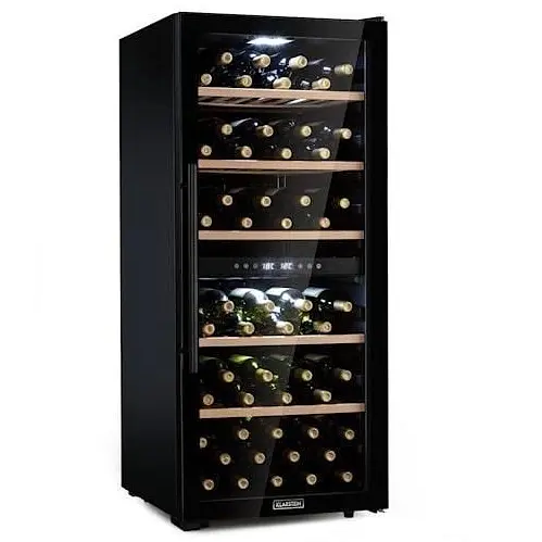 Завжди при ідеальній температурі: завдяки двом різним зонам охолодження ви завжди можете мати ідеальне вино в потрібний час за допомогою винного холодильника Klarstein Barossa 102 Duo . У верхній і нижній температурних зонах винного холодильника Klarstein Barossa 102 Duo до 102 пляшок вина охолоджуються точно на п’яти знімних дерев’яних полицях. Фронт з чорного скла з панорамним вікном із безпечного скла забезпечує стильну презентацію винних скарбів. Перемикається внутрішнє освітлення вміло підкреслює пляшки, що зберігаються.