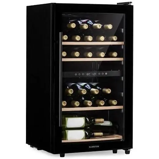 Завжди ідеальна температура: завдяки двом різним зонам охолодження ви завжди можете подати ідеальне вино в потрібний час за допомогою винного холодильника Klarstein Barossa 34 Duo . У верхній і нижній температурній зоні винного холодильника Klarstein Barossa 34 Duo до 34 пляшок вина охолоджуються з високою точністю на чотирьох знімних дерев’яних полицях. Фронт з чорного скла з панорамним вікном із безпечного скла забезпечує стильну презентацію винних скарбів. Перемикається внутрішнє освітлення вміло створює сцену для зберігання пляшок.