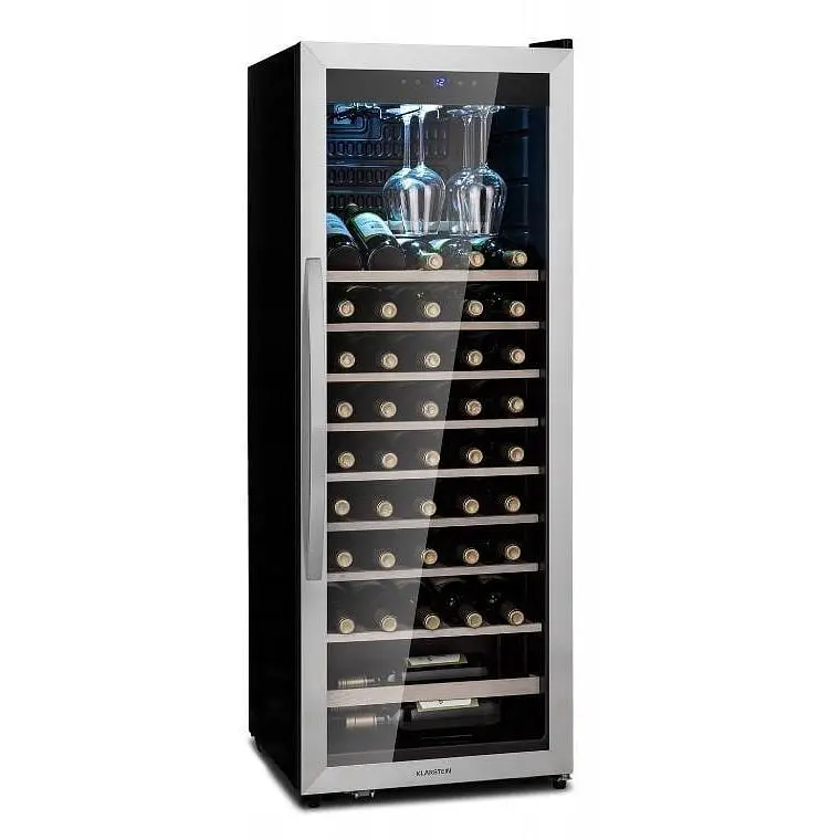 Для любові до вина: винний холодильник Klarstein Vinamour 46 Uno гарантує найкраще задоволення. З об’ємом 155 літрів він вміщує до 46 пляшок вина, розподілених на 10 рівнях і 9 дерев’яних полицях, охолоджуваних до температури від 4 до 18°C. У верхній частині передбачено місце для 6 елегантно підвішених винних келихів. Сенсорне керування зручне та просте. Завдяки внутрішньому підсвічуванню пляшки виглядають розкішно, а скляні дверцята створюють вражаючий візуальний ефект.