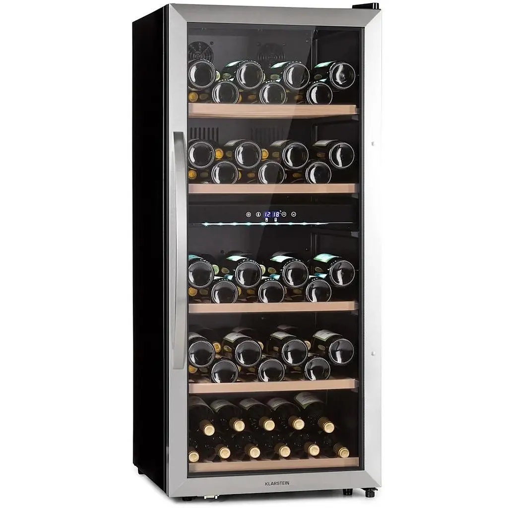 Винний холодильник Klarstein Vinamour 66 Duo забезпечить найкраща насолода вином. Завдяки двом окремим зонам охолодження він одночасно зберігає загалом 79 пляшок червоного або білого вина потрібної температури. Температуру охолодження від 5 до 18 °C можна встановити за допомогою сенсорної панелі керування, що також ідеально підходить для ігристого шампанського. Він створює розкішну атмосферу й в особливий спосіб представляє вишукані вина. Біле освітлення елегантно акцентує увагу на збережених винах, а панорамні скляні двері забезпечують гарний огляд усього.