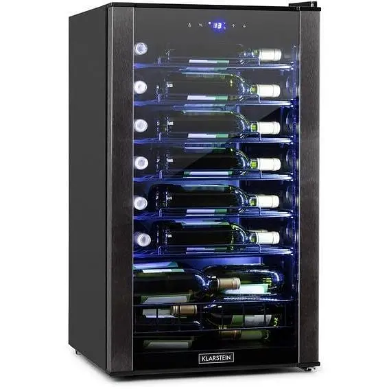 Для любові до вина: винний холодильник Klarstein Vinomatica 36 Uno забезпечує найкращу насолоду від вина, зберігаючи пляшки вина при правильній температурі пиття. Він надає особливого значення вишуканій презентації. Пляшки зберігаються горизонтально на семи рівнях, щоб їх етикетки було добре видно через великі панорамні скляні двері. Ви можете нагріти до 36 пляшок вина до ідеальної температури від 4 до 18 °C в ексклюзивному охолоджувачі вина . Нею дуже легко керувати за допомогою сенсорної панелі керування, яка сама пояснює себе.Привертає увагу всіх і надає вишуканим винам ідеальну температуру для пиття: винний холодильник Vinomatica від Klarstein