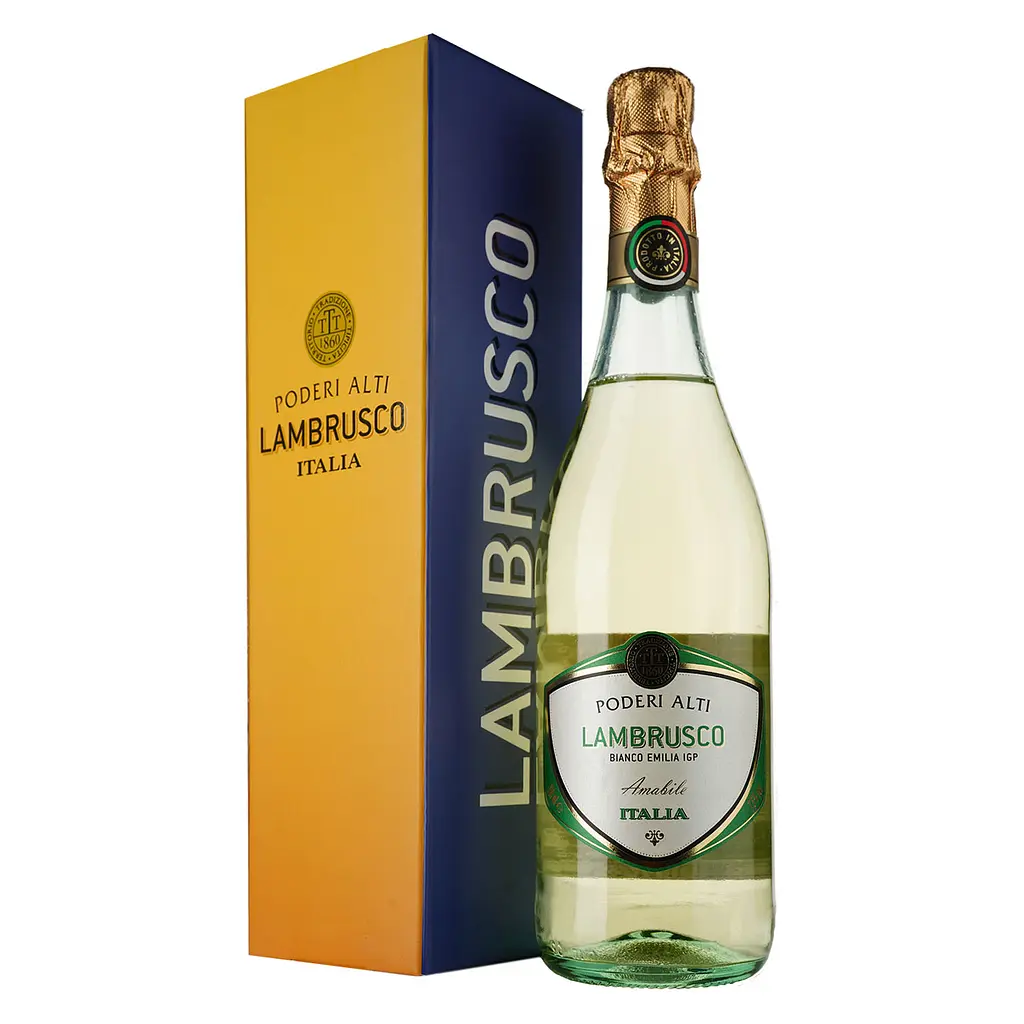 Ігристе вино Poderi Alti Lambrusco Amabile Bianco Emilia IGP має солом'яно-жовтий колір. Відрізняється свіжим ароматом із квітково-фруктовими нотками та приємним, легким смаком.
