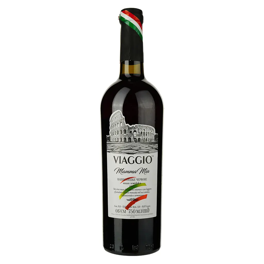 Вино Viaggio Mamma Mia з виразними відтінками темних ягід і сухофруктів, бархатистою текстурою та гармонійним смаком. Колір глибокий червоний.