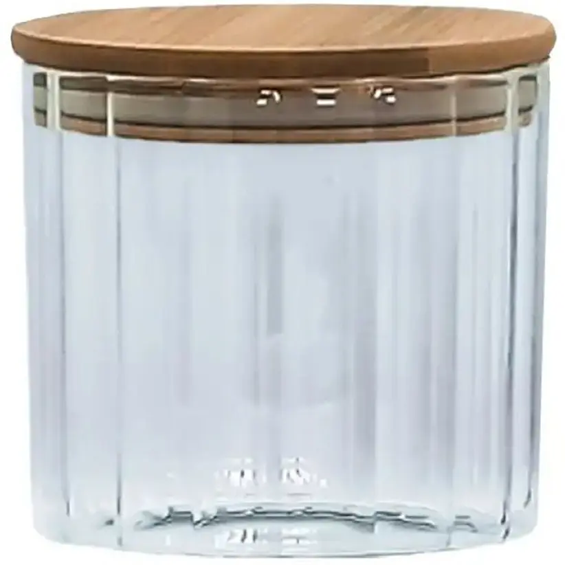 Прозора, що дозволяє бачити вміст усередині. Виготовлена з міцного скла, яке не впливає на смак та якість продуктів. Кришка дерев'яна, щільно закриває ємність та захищає її вміст від пилу та вологи. Місткість може використовуватися для компактного зберігання сипких продуктів, це практичне рішення для організації кухонного простору та зручного доступу до необхідних продуктів.
