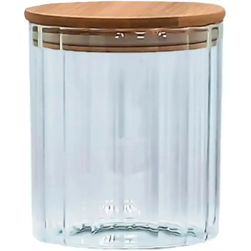 Прозора, що дозволяє бачити вміст усередині. Виготовлена з міцного скла, яке не впливає на смак та якість продуктів. Кришка дерев'яна, щільно закриває ємність та захищає її вміст від пилу та вологи. Місткість може використовуватися для компактного зберігання сипких продуктів, це практичне рішення для організації кухонного простору та зручного доступу до необхідних продуктів.