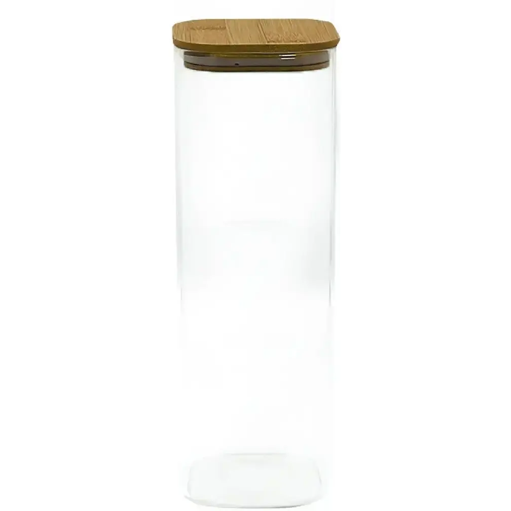 Прозора, що дозволяє бачити вміст усередині. Виготовлена з міцного скла, яке не впливає на смак та якість продуктів. Кришка дерев'яна, щільно закриває ємність та захищає її вміст від пилу та вологи. Місткість може використовуватися для компактного зберігання сипких продуктів, це практичне рішення для організації кухонного простору та зручного доступу до необхідних продуктів.