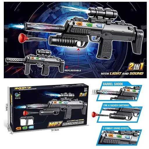 Ефекти: різнобарвне підсвічування, звуки пострілів, вібрація, автоматичний рух дула.