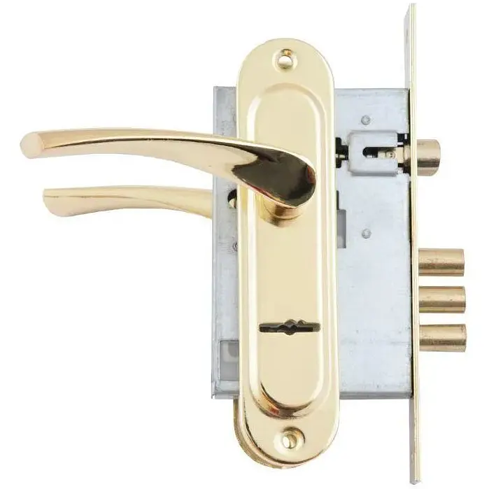 Комплект фурнітури, що включає дверні ручки на планці, врізний замок і комплект ключів. Планка виготовлена з міцного металу, а ручка з алюмінію, що забезпечує надійність та зручність у використанні. Покриття у відтінку золота (PB) надає виробу теплий золотистий блиск і захищає від корозії. Підходить для встановлення на міжкімнатні та вхідні двері.