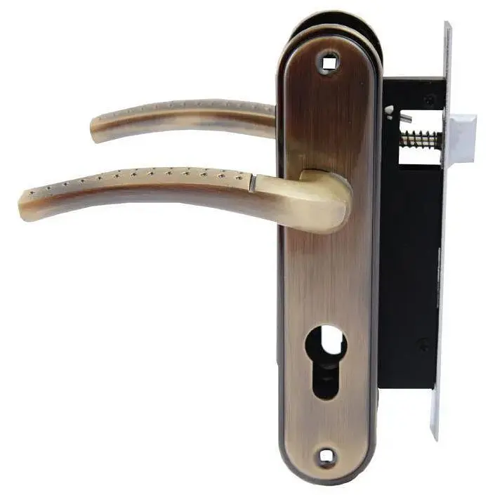 Дверна ручка на планці у комплекті з врізним замком, циліндром та трьома ключами. Ручка виготовлена з алюмінію, планка із міцного металу, що забезпечує довговічність та надійність у використанні. Міжосьова відстань – 58 мм. Покриття у відтінку бронза (AB) надає виробу класичного вигляду та стійкості до зносу. Підходить для встановлення на міжкімнатні та вхідні двері.