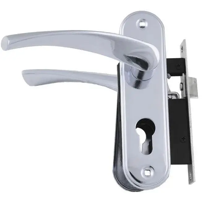 Дверна ручка на планці з корпусом у комплекті із врізним замком під циліндр. Виготовлена з комбінації міцного металу (планка) та алюмінію (ручка), що забезпечує довговічність та зносостійкість. Хромоване покриття (CP) має дзеркальний блиск і надає дверям сучасного, елегантного вигляду. Підійде для встановлення на міжкімнатні або вхідні двері.