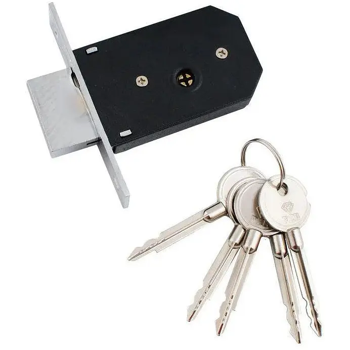 Замок урізний сувальдний, 5 ключів. Монтується в дерев'яні та металеві двері, відмінно підходить для замикань хвірток, металевих шаф, сейфів, гаражних воріт та погребів. Хрестовий ключ та унікальний механізм секретності (5500 комбінацій).
