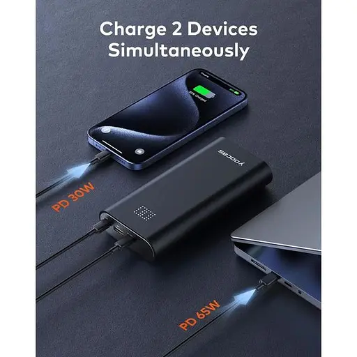 Оснащений двома портами USB-C (максимум 65 Вт) та одним портом USB-A (максимум 12 Вт), що означає, що блок живлення 20000 мАг може заряджати до 3 пристроїв одночасно. Наприклад, порт USB-C може заряджати ваш мобільний телефон і ноутбук, а порт USB-A може заряджати ваші Bluetooth-навушники та розумний годинник