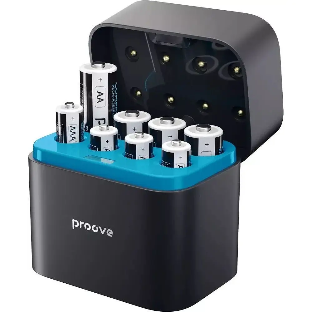 Зручність використання Proove Compact Station - це надійне рішення для заряджання до 8 батарей одночасно. Компактний дизайн дозволяє легко зберігати та використовувати пристрій вдома або в офісі. Завдяки зручним світлодіодним індикаторам заряду, ви завжди будете в курсі рівня заряду кожної батареї, що забезпечує легкість використання. Надійність та довговічність Кожна батарея може заряджатися до 400 разів, що гарантує тривалу та ефективну експлуатацію. Це робить комплект ідеальним вибором для тих, хто потребує надійного джерела енергії на тривалий термін. Економія та зручність З 8 батареями (4xAA та 4xAAA) у комплекті ви отримуєте відразу кілька запасних елементів для різних пристроїв, що дозволяє заощадити на купівлі нових батарей. Заряджання кількох елементів зменшує час очікування та підвищує зручність у використанні. Матеріал: ABS+PC Вхід Type-C (кейс): DC 5V/3A Вихід кейсу: AA: 5V/350mA; AAA: 5V/200mA Тип акумулятора: літій-іонний Місткість батареї: AA: 3000mWh; AAA: 1300mWh Вхідна напруга: AA: 5V/350mA; AAA: 5V/200mA Вихідна напруга: AA: 1.5V/2A; AAA: 1.5V/2A Час зарядки: AA: ~2.5 год; AAA: ~2 год Цикли заряджання AA/AAA: 4000 разів Розмір продукту: 71x71.5x52мм Вага: 221 г