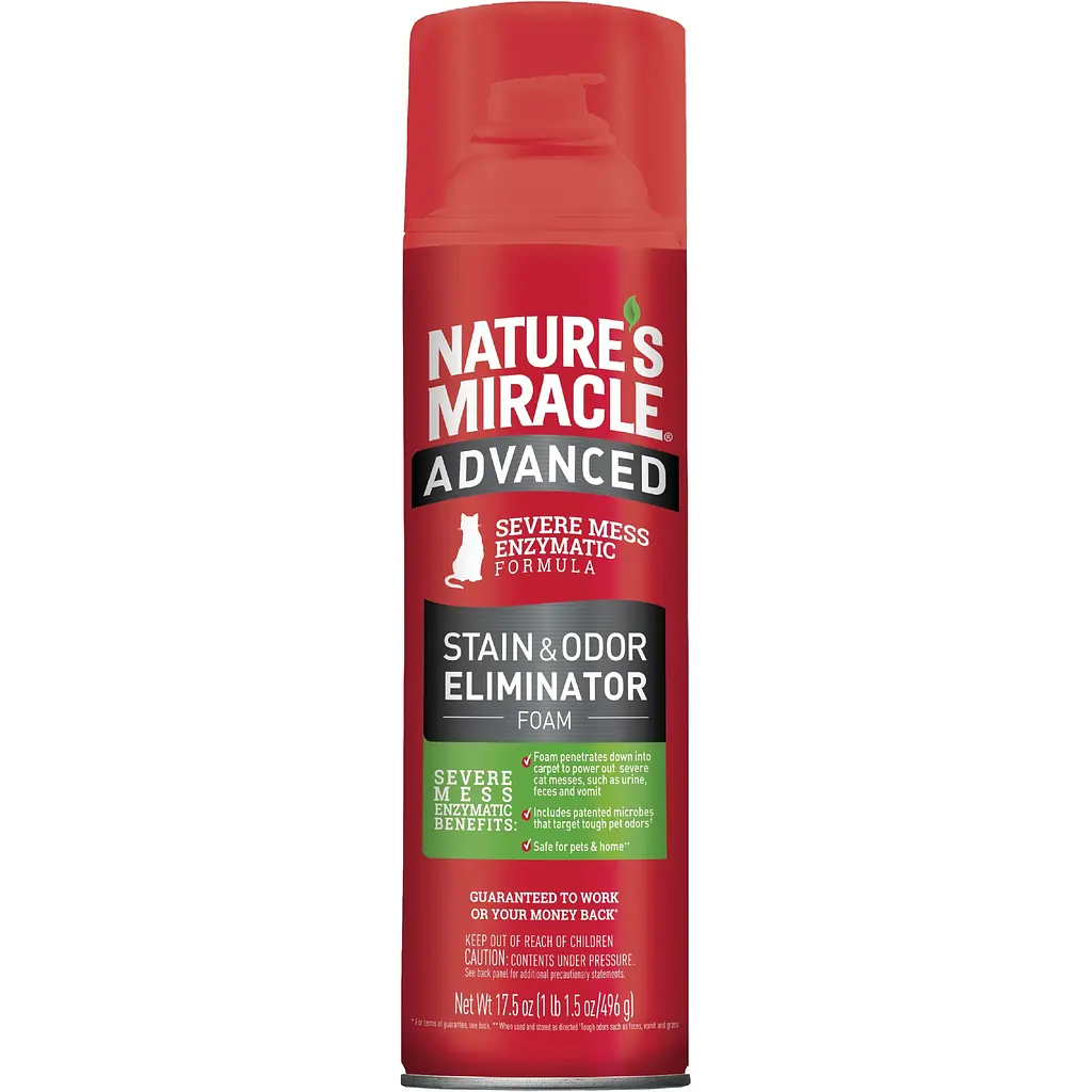Засіб 8in1 для усунення плям та запахів Nature`s Miracle Advanced Cat S&O Foam розроблений у формі аерозоль-піни для видалення плям та запахів від сечі, які важко вивести. Засіб працює на килимах, пледах, меблях, тканинах та інших поверхнях. Піна проникає глибоко в ворс поверхні, щоб ефективно видалити навіть плями, що в'їлися, і запахи.
