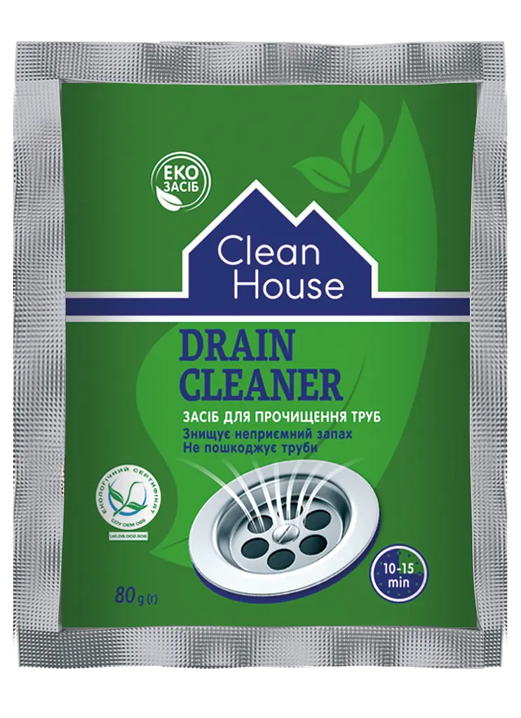Засіб для прочищення труб Clean House (Клін Хаус) має високу ефективність у боротьбі із засміченнями різного ступеня складності.