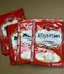 Харчовий желатин гарної якості, добре розчиняється, швидко застигає. Підходить для приготування десертів, холодців і заливних страв. Зручний у використанні.