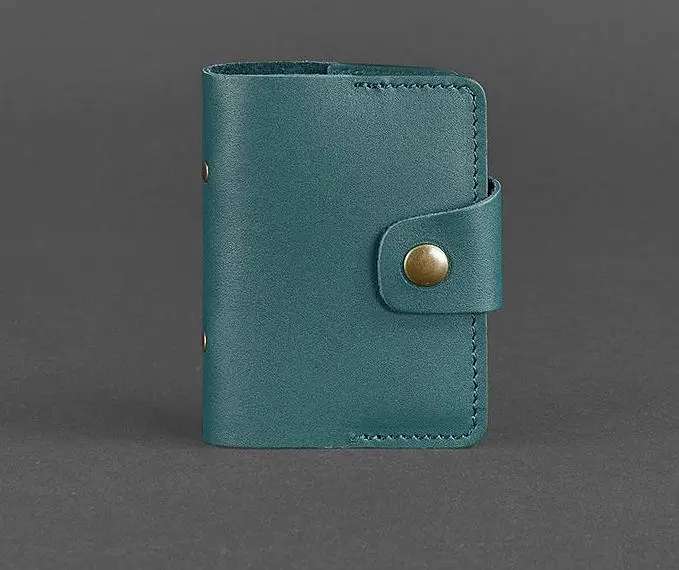 Обкладинка корд-кейса виготовлена з міцної натуральної шкіри краст модного бірюзового кольору. На внутрішній стороні обкладинки є пара кишеньок.