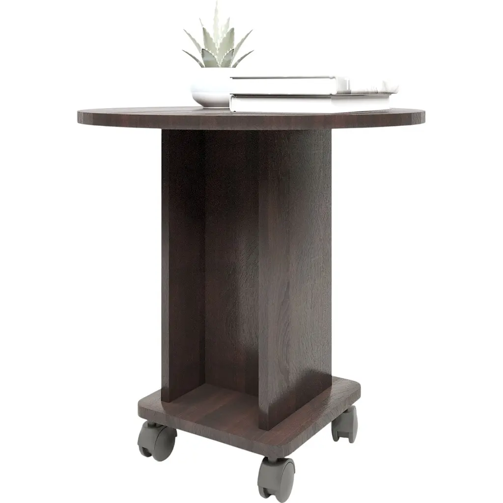 Журнальний стіл Візит від компанії Еверест виконаний у класичному стилі, завдяки цьому підійде і для облаштування вітальні, і для офісу. Практична кругла стільниця встановлена на високу дерев'яну основу з коліщатками, кріплення приховані декоративними заглушками в колір виробу. Мобільна конструкція на посилених роликах дає змогу легко пересувати столик кімнатою або перемістити його в інше приміщення. Завдяки відсутності гострих кутів на стільниці, журнальний стіл безпечний для ваших дітей. Максимальне навантаження на стіл становить 40 кг.