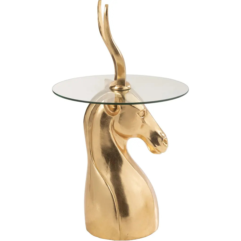 Цей стіл виконаний у стилі еклектичного арт-деко з елементами гламурного дизайну. Основу столу складає золота скульптура голови антилопи з вигнутими рогами, що додає йому екзотичності та виразності. Скляна стільниця підкреслює легкість конструкції та робить акцент на деталях скульптури. Такий сміливий та декоративний предмет ідеально підходить для інтер'єрів, де цінується індивідуальність і художній підхід до оформлення простору, зокрема у стилях арт-деко, гламур або сучасна еклектика.