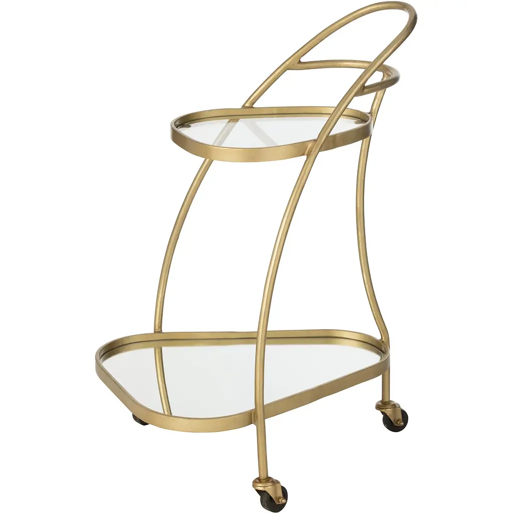 Цей сервірований візок виконаний у стилі сучасного гламурного арт-деко. Його елегантний золотистий металевий каркас і дзеркальні полички надають йому розкішного вигляду, а плавні лінії конструкції додають витонченості. Цей стиль часто поєднує функціональність з естетикою, роблячи предмет меблів не лише практичним, а й привабливим елементом декору. Такий візок стане прекрасним акцентом в інтер'єрі, оформленому в гламурному або сучасному стилі. Ідеально підходить для сучасних інтер'єрів, орієнтованих на чисті лінії та лаконічність.