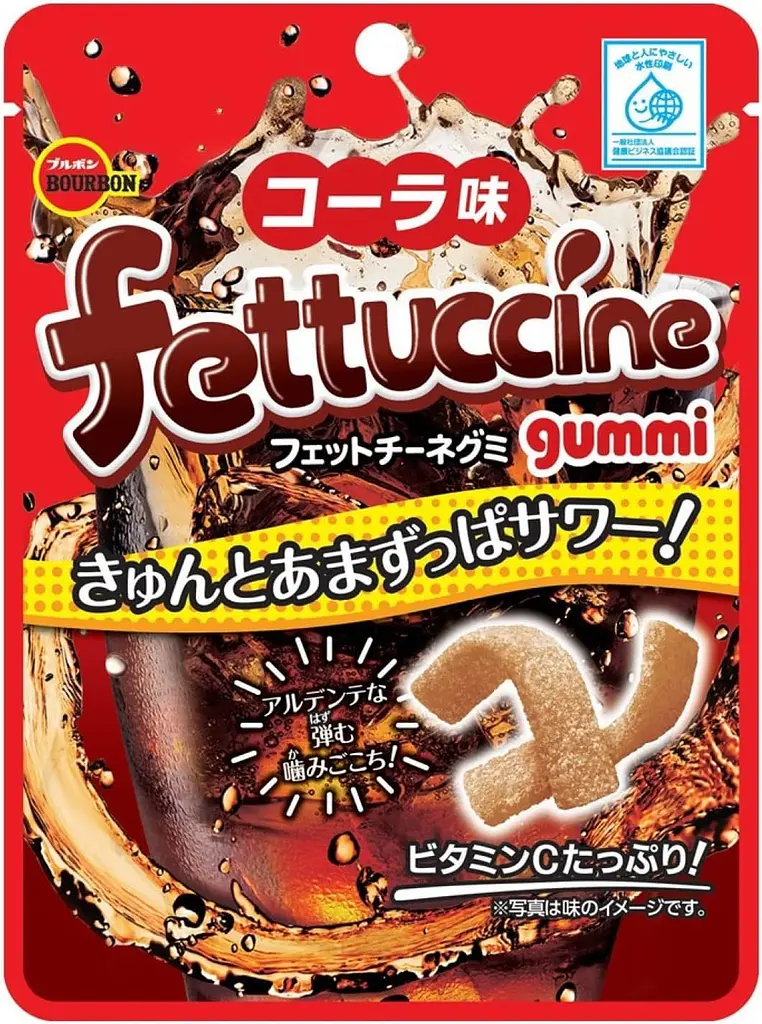Популярні японські ласощі з яскравим смаком класичної коли та приємною кислинкою. Цукерки виконані у формі тонких «локшинок», покритих цукровою кисло-солодкою пудрою, яка робить смак більш освіжаючим та насиченим. Завдяки фірмовій текстурі Fettuccine Gummi, мармелад має пружність "аль денте" - м'який зовні і злегка жувальний всередині.
