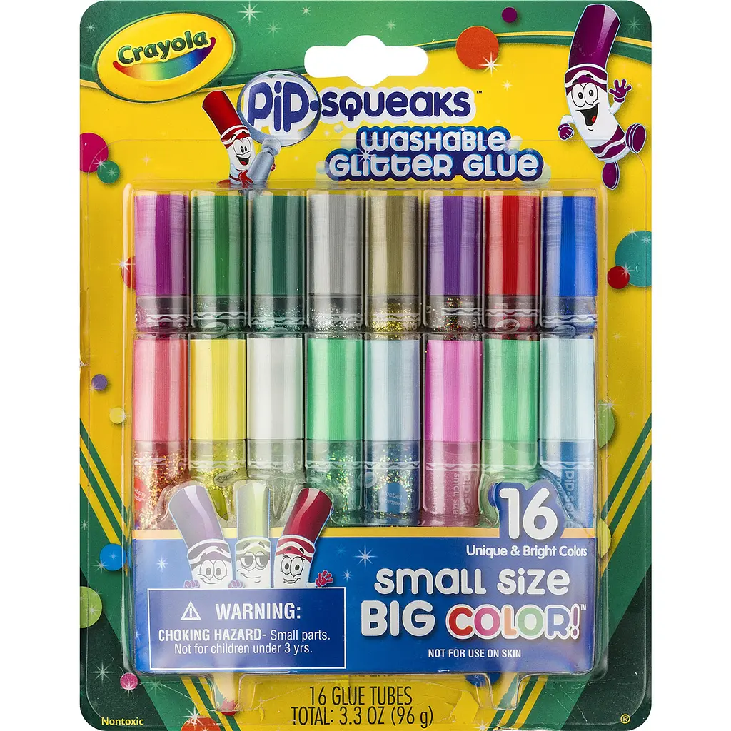 Набір клею Crayola PiP-Squeaks Washable Glitter Glue Unique & Bright Colors з блискітками в тюбиках пропонує зручний маленький розмір з чудовим блискучим кольором. Він ідеально підходить для шкільних та домашніх проєктів, його легко зберігати та носити з собою. Набір містить 16 мінітюбиків різноманітних кольорів.