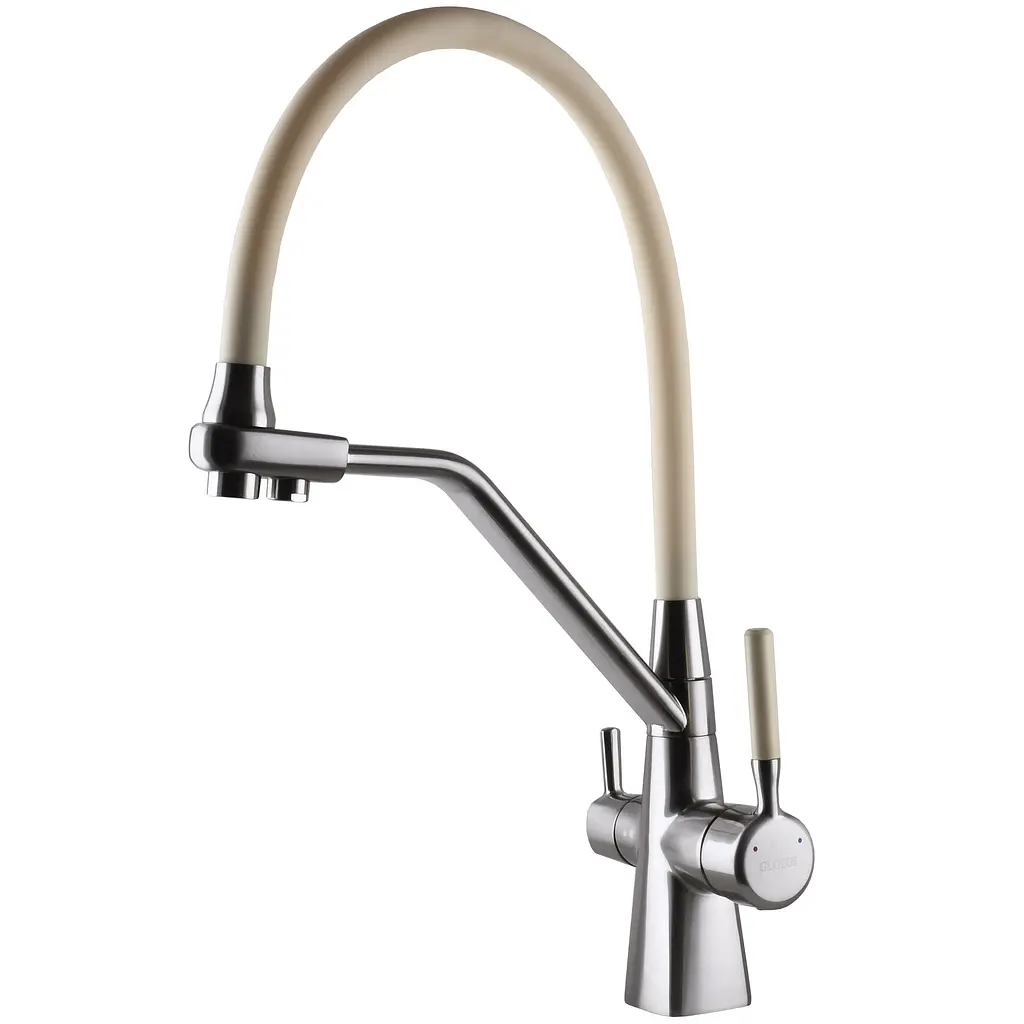 Кухонний змішувач Globus Lux LAZER GLLR-0700-L-08-06, комбінований під ОСМОС, гофрогусак кольору слонова кістка, колір корпусу- нержавіюча сталь Комбінований змішувач вражає своєю продуманістю до використання і монтажу. Переваги комбінованих під систему зворотного осмосу моделей змішувачів Globus Lux: Вид монтажу: Врізний Вид змішувача: Одноважільний з перемиканням під осмос Тип виливу: Поворотний Підключення до фільтру і водопроводу- шланг + Quick fitting Діаметр підключення шлангів 1/2 ″ Кріплення - гайка Матеріал: Латунь Колір виробу: Нержавіюча сталь/слонова кістка Додаткові характеристики: - Монтаж на один отвір - Металевий важіль - Система швидкого монтажу - Гнучка проводка Країна реєстрації бренду: Україна Гарантія: 60 місяців офіційної гарантії від виробника. Вага нетто: 2,18 кг Вага брутто: 2,685 кг Розмір упаковки ВхШхГ: 30х50х8 см Характеристики : Країна походження : Китай Країна реєстрації бренду : Україна Серія : LAZER Призначення : Змішувачі для осмосу Вид монтажу : Врізний Керування : Двоважельний Матеріал : Латунь Колір : Бежевий Тип виливу : Гнучкий Термостат : Немає Вага брутто (кг.) : 2.280000 Об'єм (м³) : 0.009933