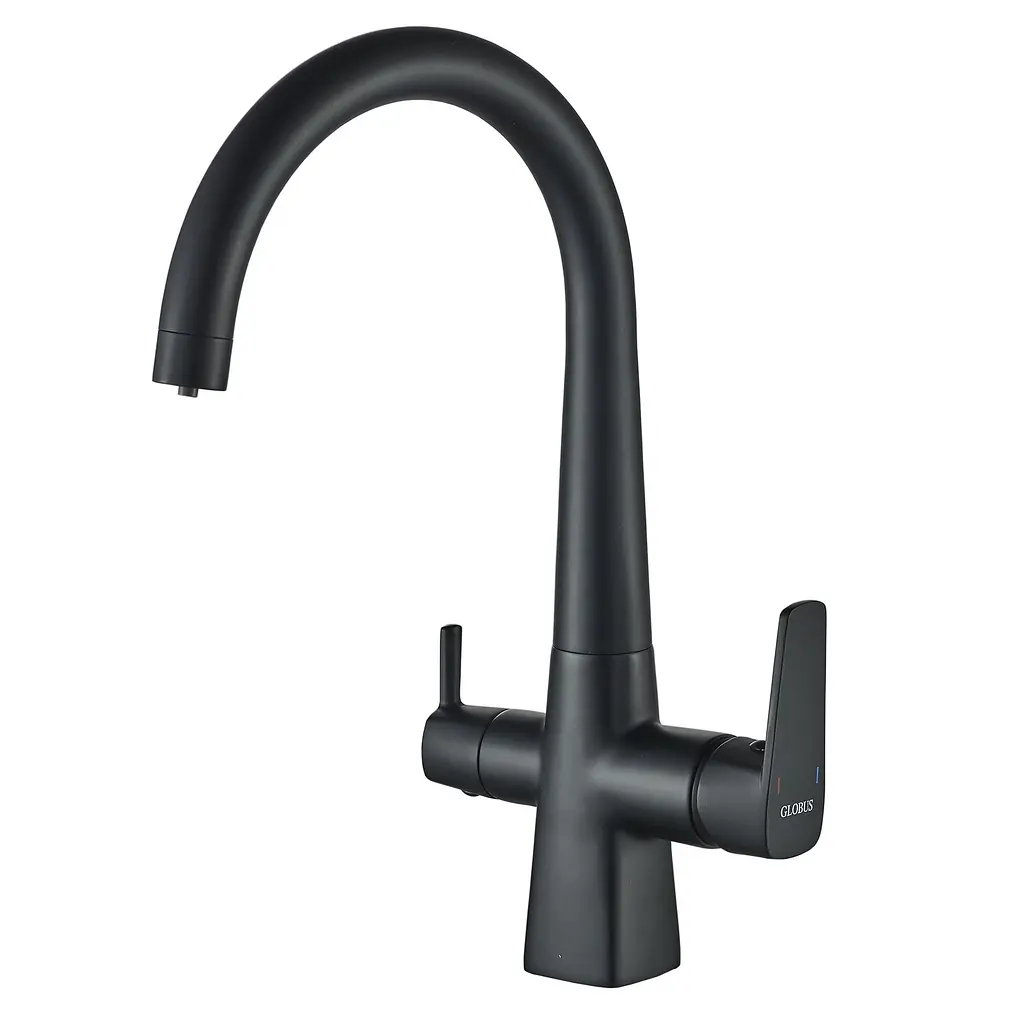 Змішувач Globus Lux Lazer GLLR-0999-1-ONIX комбінований під ОСМОС на гайці, колір матовий чорний Ідеально підходить до гранітної мийці, функціональні комбінованого змішувача вражає своєю продуманістю до використання і монтажу. Вишуканий матовий чорний колір задовольнить найвибагливіших покупців. Переваги комбінованих під систему зворотного осмосу моделей змішувачів Globus Lux: 1. Довговічність і безвідмовність в експлуатації 2. Вилив обертається на 360 градусів і зручний для кухонних мийок з декількома чашами 3. Елегантність форм, міцність і надійність 4. Висока функціональність 5. Використання якісних екологічно чистих матеріалів 6. Інноваційні технології виробництва 7. Корпус виготовлений з латуні з вмістом міді не менше 70% Комплектація: - Змішувач латуний - Шланги М10 * 1/2-3шт - Quick fitting 1/4 "-1/2" (зовнішня різьба) - Кріплення для змішувача - гайка Змішувач має 3 контури для підключення води: - 1 і 2 використовується для підключення холодної та гарячої води. Змішування води відбувається за допомогою стандартного картриджа з маленькою рукояткою; - 3 контур використовується для підключення очищеної води. Відкриття чистої води здійснюється за допомогою іншого картриджа з великою рукояткою.