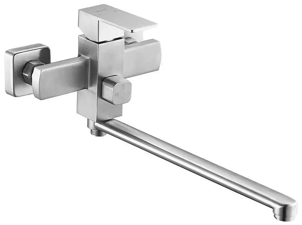 Змішувач для ванни одноважільний, гусак 32 див. Корпус виготовлений із нержавіючої сталі, що значно збільшує термін експлуатації змішувача. Використовується безшумний керамічний картридж Ø35 з підвищеним ресурсом, а також аератор, що пом'якшує та економить витрату води. Чудово поєднується у ванних кімнатах стилю hi-tech.