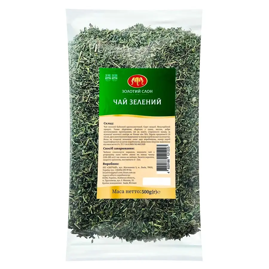 Чай зелений Золотий Слон дрібнолистовий – вишуканий дрібнолистовий зелений чай, виготовлений із добірного індійського чайного листя, що вирізняється освіжаючим світло-зеленим відтінком настою, свіжим, ніжним смаком і нектарним ароматом. Цей напій забезпечує заряд бадьорості та має численні корисні властивості для здоров’я, зокрема сприяє покращенню метаболізму, антиоксидантному захисту та загальному самопочуттю завдяки природним компонентам. Завдяки високій якості сировини та дбайливій обробці чай зберігає стабільний смаковий букет, що робить його ідеальним для щоденного вживання, будь то ранкове пробудження, перерва протягом дня чи вечірній релакс. Упаковка вагою 500 г дозволяє економно використовувати продукт, забезпечуючи свіжість і аромат для тривалого насолодження. Відповідаючи високим стандартам якості, чай Золотий Слон зелений дрібнолистовий дарує бадьорість, гармонію та насолоду кожною чашкою.