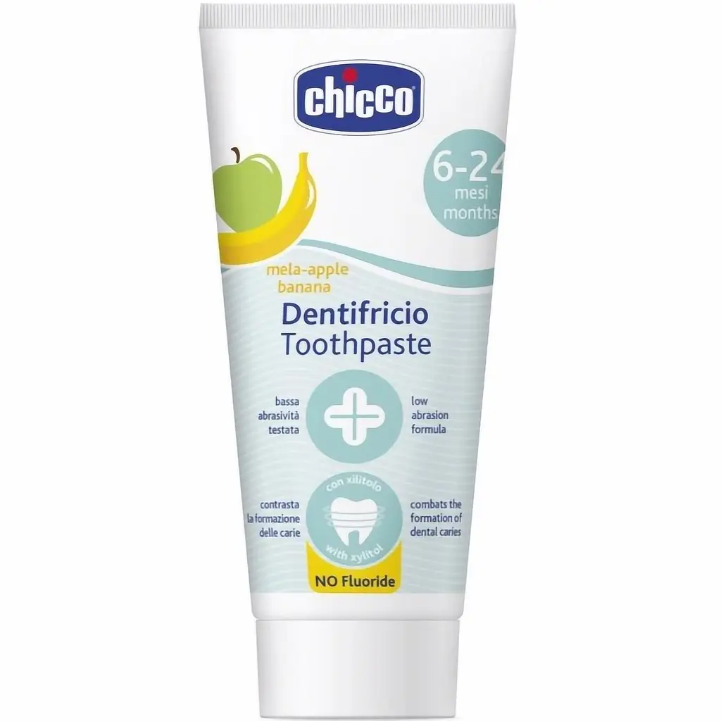 Зубна паста Chicco (Чіко) Яблуко-Банан ефективно усуває наліт, освіжає дихання та захищає зуби від утворення карієсу.