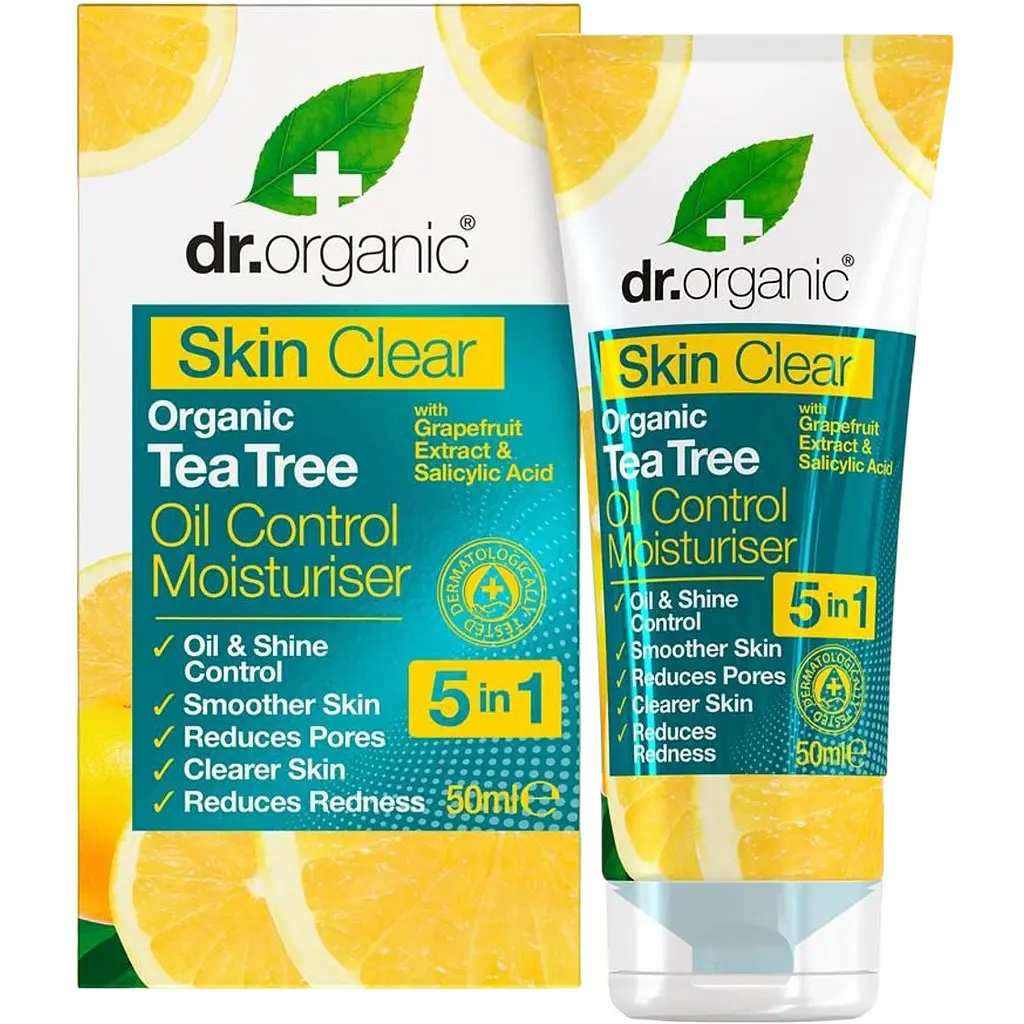 Skin Clear Organic Tea Tree Oil Control Moisturizer від dr.organic - це дерматологічно протестований зволожуючий крем для обличчя, що ідеально підходить для шкіри з недосконалістю або жирної шкіри зі схильністю до акне. Завдяки спеціальному складу допомагає контролювати жирність шкіри, надаючи їй гладкішу текстуру і сяючий вигляд. Містить органічну олію чайного дерева, екстракт грейпфрута та шкірки верби, а також багатий на натуральні фруктові кислоти (AHA) та саліцилову кислоту (BHA), які прискорюють оновлення клітин шкіри.