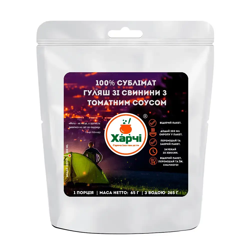 Сублимированный гуляш (свинина 62%, лук жареный, томатный соус 8%, соль, сахар)
