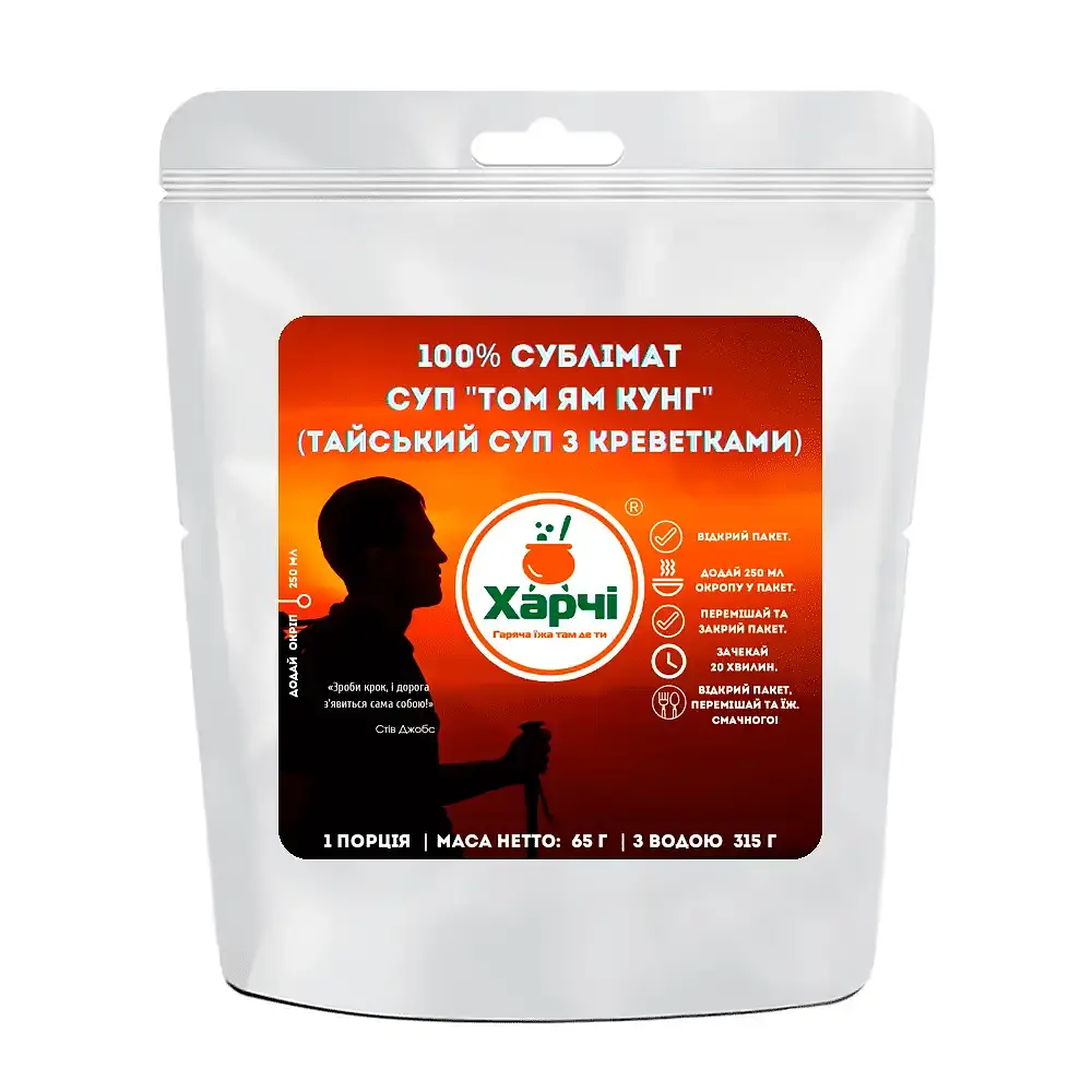 Сублимированный суп "Том Ям Кунг" (куриный бульон, лемонграсс, лук шалот, соевое масло, перец чили, галангал, чеснок, имбирь, пальмовый сахар, цедра каффир лайма, рыбный соус, тамаринд, помидоры, креветки; сухое кокосовое молоко, шампиньоны, куркума, кинза, соль