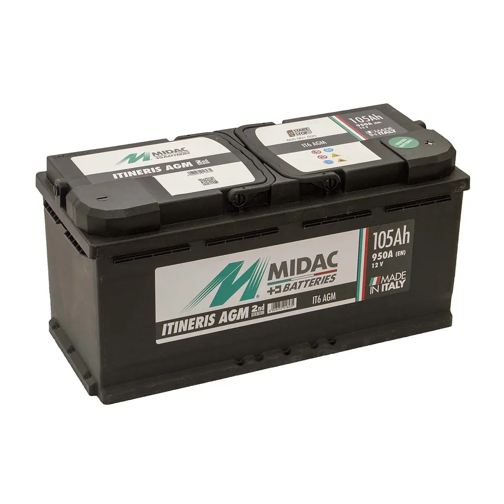 Новое поколение аккумуляторных батарей START & STOP Новая линейка аккумуляторних батарей для транспортных средств, оборудованных системой START & STOP и альтернативными технологиями экономии горючего. AGM ABSORPTIVE GLASS MAT TECHNOLOGY (Технология производцтва аккумуляторних батарей со стекловолоконным наполнителем, который служит сепаратором и абсорбированым в него электролитом) 1. Специальные добавки, которые использууються для того, чтобы сделать активный материал более компактным и устойчивым к циклам заряд/розряд; 2. Электролит, содержащийся в сепараторе с микроволокном; 3. Минимальная стратификация (расслоение) электролита; 4. Может размещаться в салоне или в багажном отделении. Преимущества AGM аккумуляторных батарей Midac • Идеально двигателей START&STOP, оснащенных системой рекуперации (восстановления) тормозной энергии; • Соответствует требованиям к автомобильным аккумуляторам START & STOP относительно условий безопасности при опрокидывании автомобиля; • Мощная решетка аккумуляторных пластин, разработанная на специальной основе для обеспечения высокой производительности при запуске, отличном принятии заряда и идеальной адгезии активного материала; • Аккумуляторы Midac всегда доставляются с максимальным уровнем заряда, благодаря высокотехнологичному оборудованию и передовым программам зарядки АКБ.