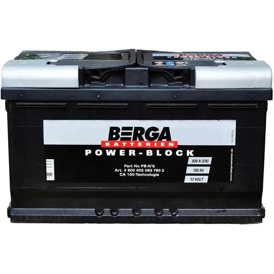 Berga Power Block 6СТ-100А АзЕ - автомобильный аккумулятор АКБ наделен отличными эксплуатационными характеристиками, которые соответствуют высокому немецкому качеству. АКБ BERGA выполнены по новейшим разработкам, все модели усовершенствованы и наделены превосходными качествами, которые делают батарею виброустойчивой не требующей постоянного обслуживания. Электрическое сопротивление снижено благодаря добавленному в состав серебру. В процессе запуска происходит мгновенный и плотный контакт активной массы с полезной площадью.